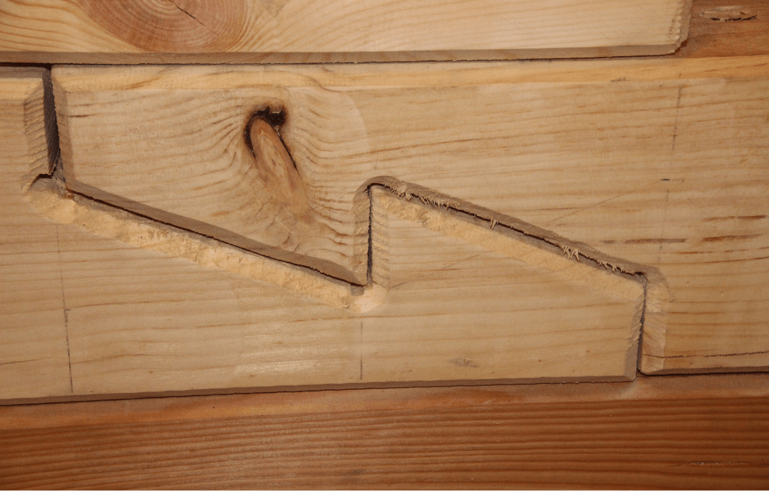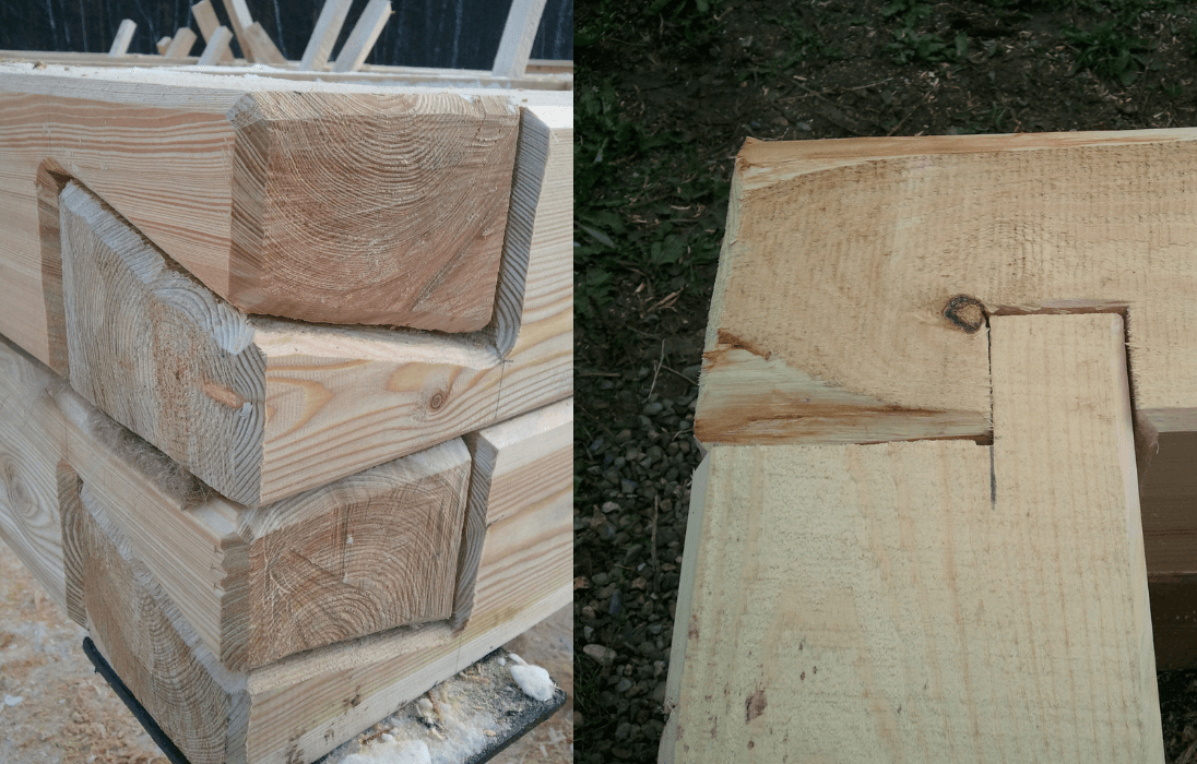 Для угловых соединений первых листвяжных венцов используем замок "Косая лапа", что дает колоссальную прочность в двух плоскостях